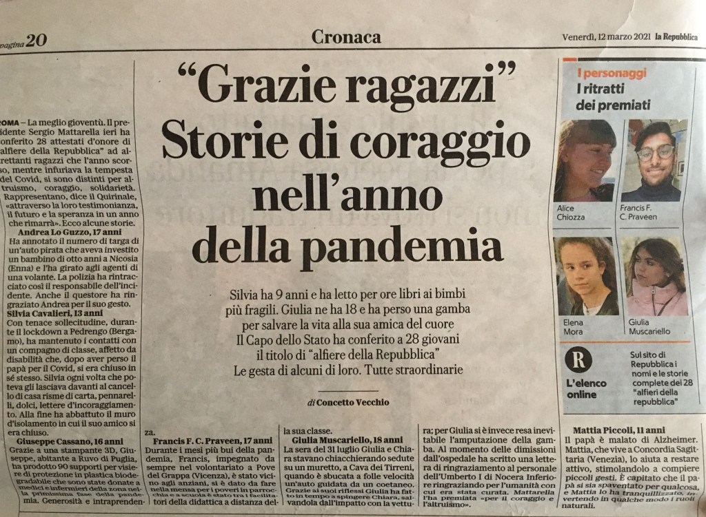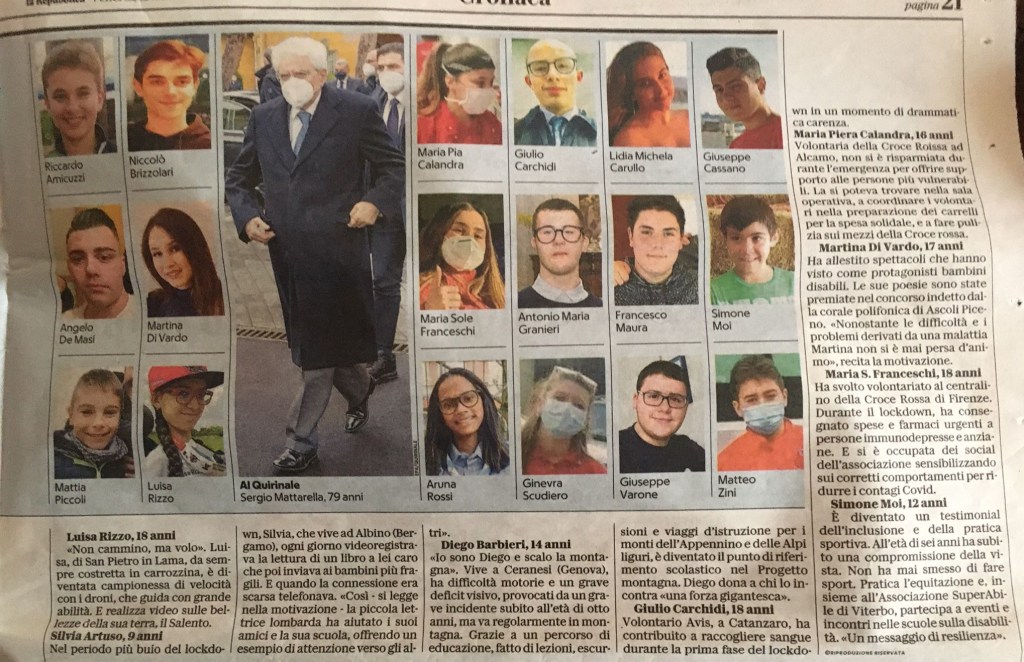 commento: come ogni anno il Presidente della Repubblica ha conferito il titolo di Alfieri della Repubblica ad un gruppo di giovani che si sono distinti nel campo della cultura, dell’impegno sociale o dello sport. Nell’anno della pandemia, i premiati dal Presidente Sergio Mattarella sono stati i ragazzi che hanno deciso di affrontare in prima persona l’emergenza e, nel loro piccolo, dedicarsi agli altri sfruttando le proprie qualità e contribuendo alla cura della cittadinanza. Per fortuna c’è una buona parte di giovani e giovanissimi che si comportano in modo ammirevole. Possiamo aver fiducia nel futuro.