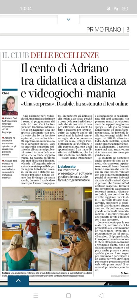 La notizia: Adriano Caci, un ragazzo di Bollate affetto da atrofia muscolare spinale, ha conseguito il diploma di maturità presso l’Istituto di Studi Superiori (ISS) Lagrange di Milano, che ha frequentato con indirizzo informatico ed eccellenti voti, sostenendo i test online con una tesi sui video-giochi.