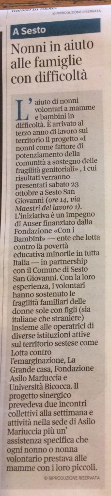 La Notizia: è arrivata al terzo anno l’esperienza dei “nonni di comunità” di Sesto san Giovanni. Il progetto (vedi anche il nostro articolo del 20 febbraio di quets’anno) si basa sui nonni come fattore di potenziamento della comunità a sostegno delle fragilità genitoriali.