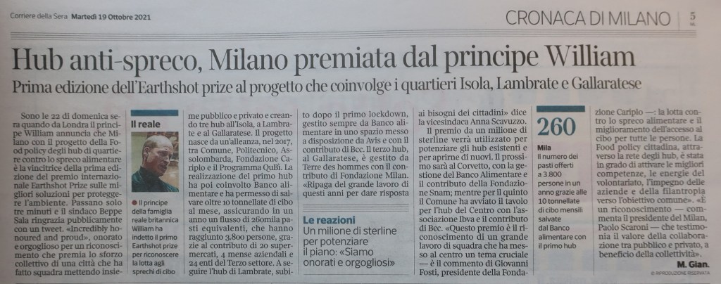 la notizia : Milano vince in una delle categorie della prima edizione dell’Earthshot Prize, riconoscimento internazionale sulle migliori soluzioni per proteggere l’ambiente. La cerimonia si è svolta all’Alexandra Palace di Londra alla presenza del principe William e della moglie Kate Middleton. Il progetto milanese che ha vinto la categoria “Un mondo senza sprechi” è quello degli Hub di quartiere contro lo spreco alimentare, nati poco prima dell’emergenza coronavirus e consolidati nel pieno del bisogno come realtà di aiuto e di recupero, sotto il cappello della ‘Food policy’ a cui aderisce il Comune di Milano dai tempi di Expo.